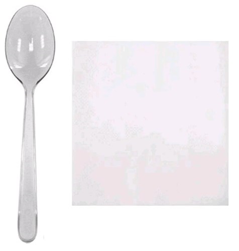 Ложка прозрачная пластиковая длинной 18см поставляется в комплекте вместе с белой бумажной салфеткой.